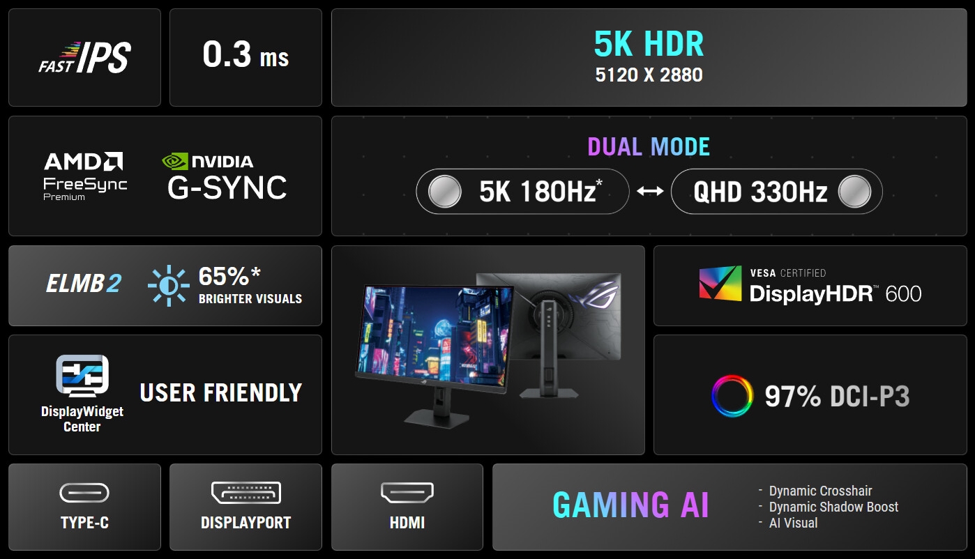 Az ASUS nem verte nagy dobra, hogy a portfóliójában megjelent a ROG Strix 5K XG27JCG névre keresztelt gaming monitor, amelynek érdekessége, hogy 5120x2880 pixeles felbontás mellett egészen 180 Hz-ig húzható a képfrissítési rátája, 1440p-ben pedig már 330 Hz-re képes.