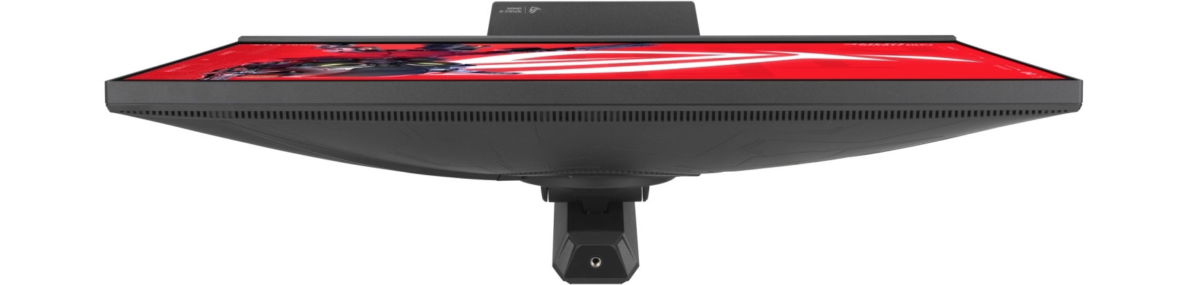 A jellemzően 40 watt alatt fogyasztó kijelző Aura Sync-es ROG logóval díszített hátulján egy DSC-s DisplayPort 1.4, két HDMI 2.1 FRL bemenet, egy DisplayPort alt módos, 15 wattnyi kakaót közvetítő USB Type-C kapu, három USB 3.2 Gen 1 Type-A csatoló, illetve egy 3,5 mm-es audio jack található, és kábelvezető réssel perforált, 100 x 100 mm-es VESA furatokba kapaszkodó talpazata mindenhogy mozgatható.