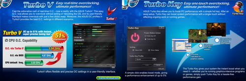 A teljesítményt szoftveres extrákkal is igyekeztek megnövelni, így ezeknél az alaplapoknál megtalálható lesz az Turbo Key és a Turbo V technológia is. Előbbi segítségével egy gyorsbillentyű állítható be, aminek aktiválásával körülbelül 5%-kal magasabb teljesítményt lehet elérni. A komolyabb túlhajtást a Turbo V szoftver használatával lehet kieszközölni, segítségével a főbb komponensek órajelei mellett azok feszültsége is szabadon állítható. A végleges, kitapasztalt beállításokat külön-külön profilok tárolhatják.