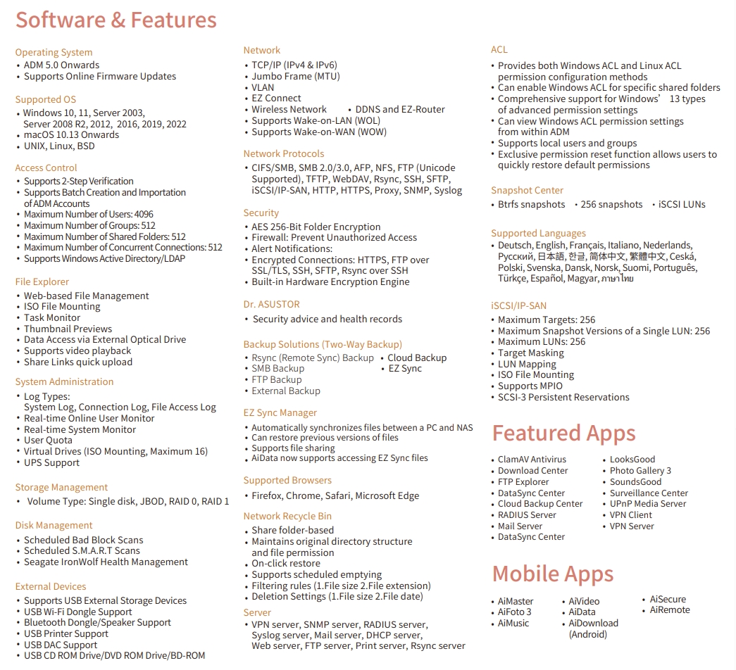 A 65 vagy 90 wattos adapterrel hajtott, 256 bites AES titkosítást alkalmazó páros a CIFS/SMB, SMB 2.0/3.0, AFP, NFS, FTP (Unicode Supported), TFTP, WebDAV, Rsync, SSH, SFTP és iSCSI/IP-SA hálózati protokollokat ismeri, és 4096 felhasználót, 512 megosztott mappát, továbbá 512 egyidejű kapcsolatot tud kiszolgálni. Az ADM 5.0 szoftverkörnyezetet futtató eszközök komplett adatvédelmi csomaggal jönnek, és számos módot kínálnak biztonsági mentések készítéséhez/adatszinkronizációhoz, okostelefonunkon keresztül pedig az EZ Connect mobilapplikáció segítségével férhetünk hozzá az állományainkhoz.