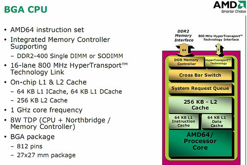 A jelenleg még név nélküli, az Intel Atommal, illetve a VIA Nanóval konkuráló CPU állítólag 1 GHz-en üzemel és 8 wattot fogyaszt. Ez több mint háromszorosa az 1,6 GHz-es Intel Atom N270 2,5 wattos fogyasztásának, ami valószínűleg azzal magyarázható, hogy az AMD a memóriavezérlő mellett az északi hidat is a CPU-ba integrálja.