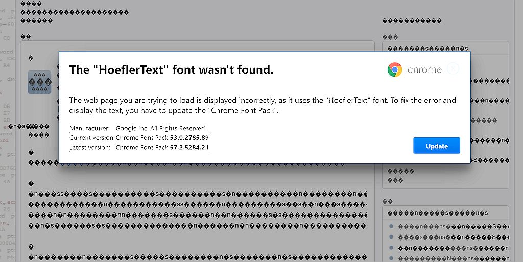 A jelen pillanatban csak néhány vírusirtó által detektált program akkor kerülhet gépünkre, ha véletlenül egy fertőzött weboldalra tévedünk. Ilyenkor először csak krikszkrakszokat látunk, majd egy, magát a Chrome valamilyen kiegészítőjének álcázó ablak ugrik fel azzal, hogy a számítógépen található betűkészlet elavult, telepíteni kell az újabb verziót. Az Update gombra kattintva természetesen nem a fontokat kapjuk, hanem a kártevőt, amelynek funkciói egyelőre nem ismertek.