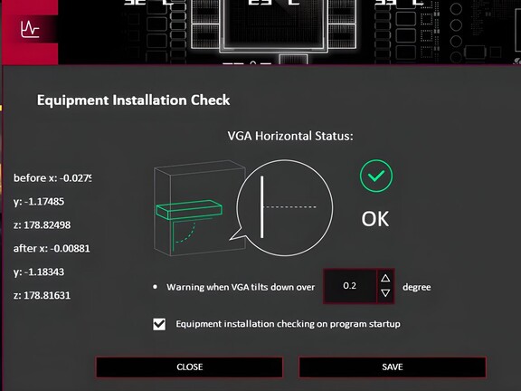 Ennek megelőzésére az ASUS ROG Astral VGA-k fedélzetén egy megrogyást jelző rendszer teljesít szolgálatot, amit egy Bosch BMI323 IMU hajt. Ebben a chipben egyaránt van giroszkóp, illetve gyorsulásmérő, így meg tudja határozni, ha a hardver tájolása eltér az optimálistól, és a bootolás idején kommunikálni kezd a GPU Tweak III szoftverrel, ami az "Equipment Instation Check" funkció segítségével kiolvassa a dőlési szöget, megállapítva, hogy szintben van-e a képalkotó vagy sem.