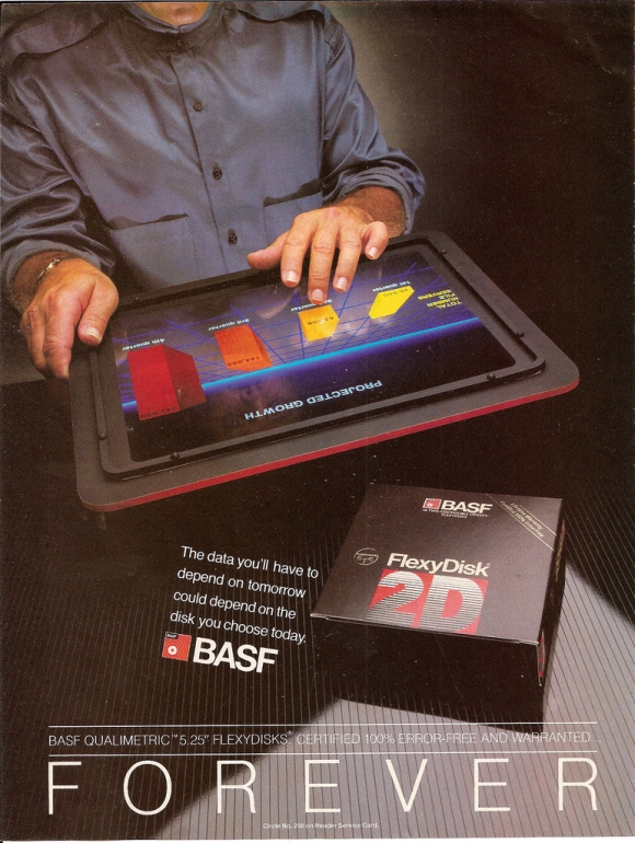 A BASF 1983-ban mutatta be 5,25 hüvelykes, Qualimetric FlexyDisk típusú mágneslemezeit. Az ehhez kapcsolódó marketingkommunikációs kampány részeként jelent meg a képen látható, újságban megjelent reklám is. Érdekessége az, hogy ezen a cég nagyjából tökéletesen megjósolta, hogy lesznek tabletek, illetve ezek hogyan fognak kinézni és működni. Ironikus, hogy az adattárolás jövőjét nem sikerült belőniük, pedig számukra ez lett volna igazán fontos. A BASF ugyanis mára ebből az iparágból kivonult, noha a vállalat még létezik.