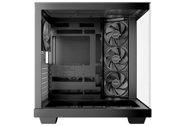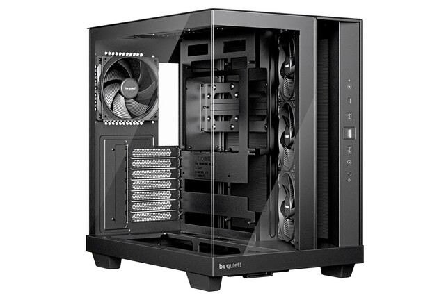E Pure Wings 3 légkavarókból három fordított lapátokkal dolgozik, és a grafikus vezérlő irányába megdöntött – kiszedhető – oldalpanelen állomásozik, de a vizezés kedvelőiről sem feledkeztek meg a tervezők, ugyanis három radiátor behelyezésére van módunk, amelyekből a felülső 360 mm-esre nőhet. Klasszikus kivitelű háttértárolókból két 2,5, meg két 3,5 hüvelykes modell fér el belül, és az előlapi kivezetések egy USB 3.2 Gen 2 Type-C kapuban, két USB 3.2 Gen 1 Type-A konnektorban, plusz egy 3,5 mm-es kombójackben merülnek ki.