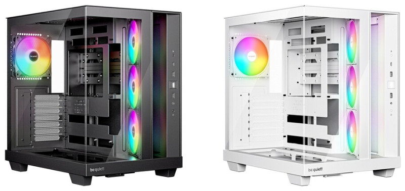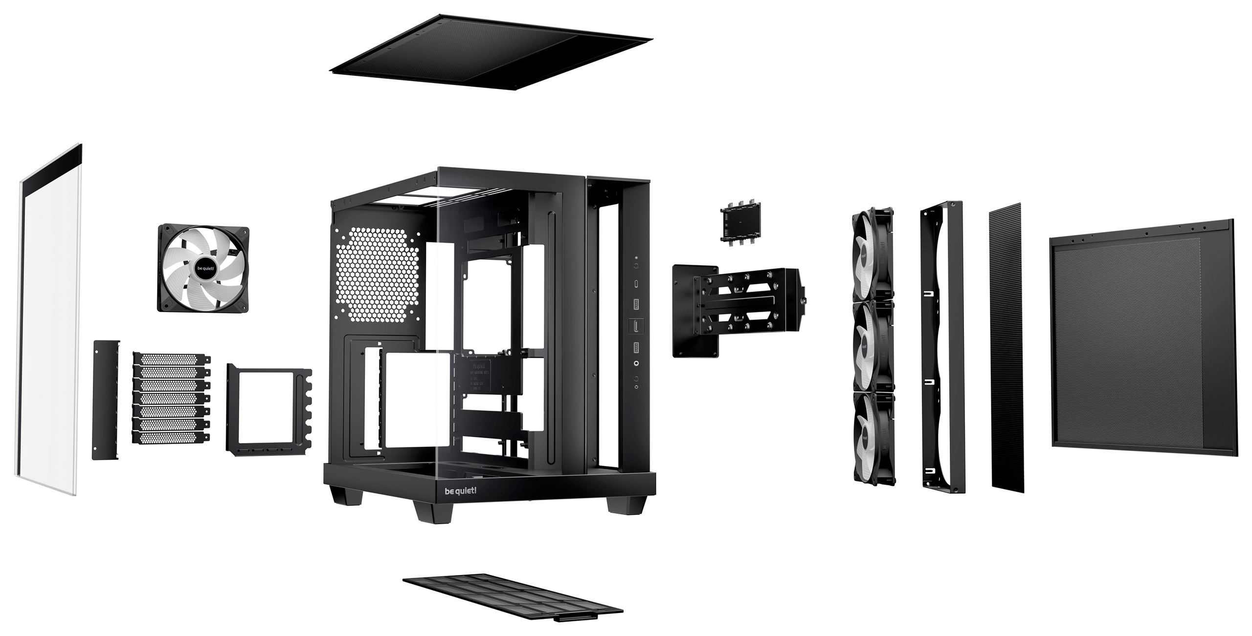 A be quiet! a Light Base 500 nevű, ATX-es házzal adott magáról életjelet, ami a Lian Li O11 által népszerűsített dizájnnal érkezik, szóval a vertikálisan kettéosztott belterét szemből és balról edzett üveglapok határolják, merevítőoszlop nélkül.