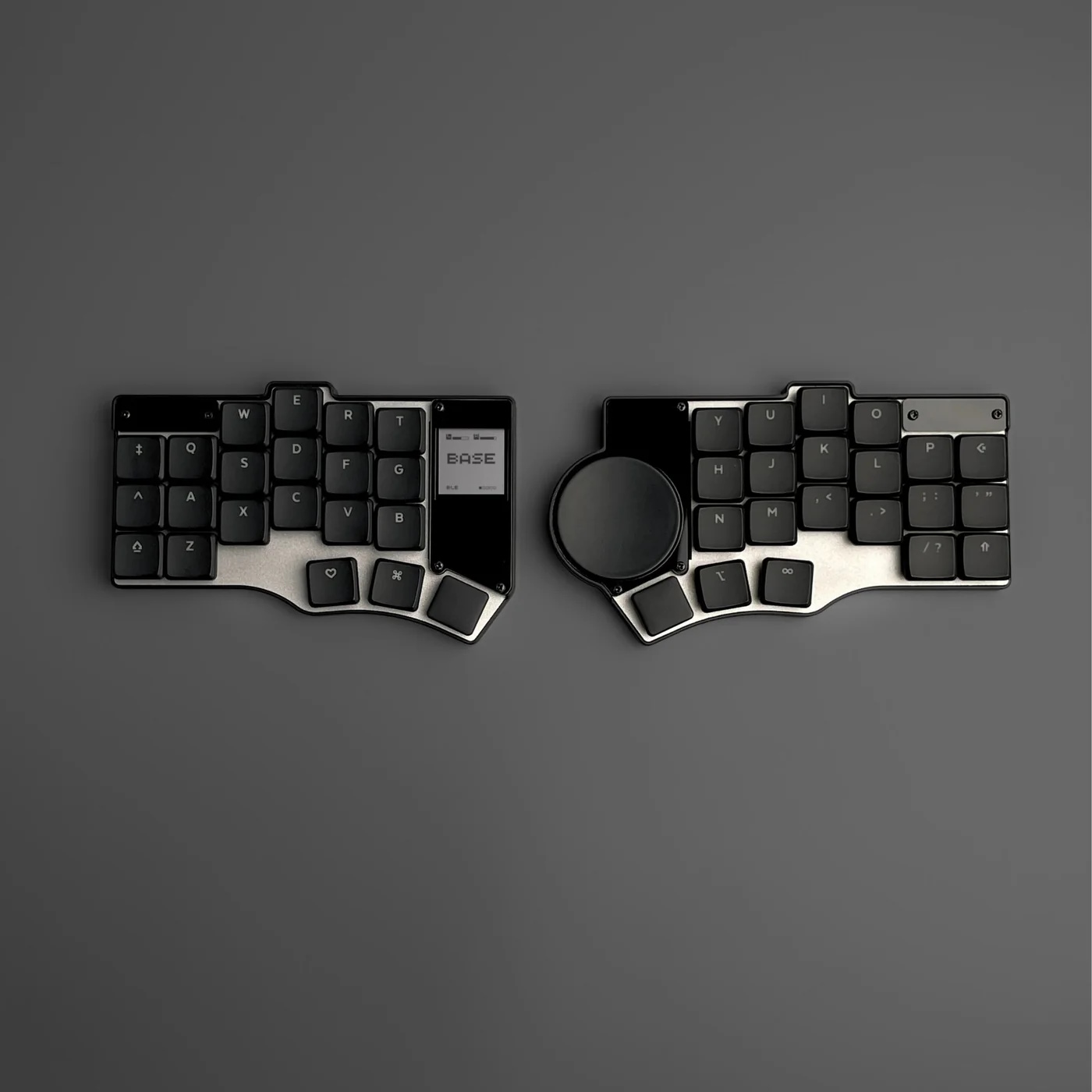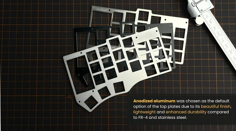 A készülékházak alsó szekciója 3D nyomtatott PLA műanyagból van, viszont a plate-ként funkcionáló felső része eloxált alumínium, és egy kis akrildekorációnak is szorítottak helyet a csöppségen. A bal oldali egységen egy MiP (Memory-in-pixel) kijelző figyel, amin státuszinformációkat (például világítási vagy csatlakozási mód) követhetünk nyomon, jobb oldali társán pedig egy 40 mm-es, kerek GlidePoint tapipad táborozott le.