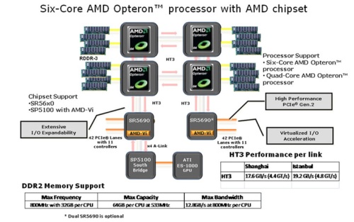 A vezérlőhidak párosával összesen négy Socket F tokozású Opteront kezelnek, míg a déli híd az egyik lapkához köthető. A rendszert az ATI ES1000 grafikus processzor teszi teljessé, ami négy PCI Express csatornán kapcsolódik az SP5100 jelzésű lapkához. Az SR5690, az SR5670 és az SR5650 nevű vezérlők támogatják a teljes sebességű HyperTransport 3.0 linket, a HotPlug képességgel felvértezett PCI Express 2.0 csatlakozókat, valamint az I/O Memory Management egységet (IOMMU). Ez a technológia a platform virtualizációs teljesítményét hivatott megnövelni, közvetlenebb kapcsolatot teremtve a processzor és az I/O egységek között, továbbá képes megakadályozni az I/O eszközök illegális memóriahozzáférését is.