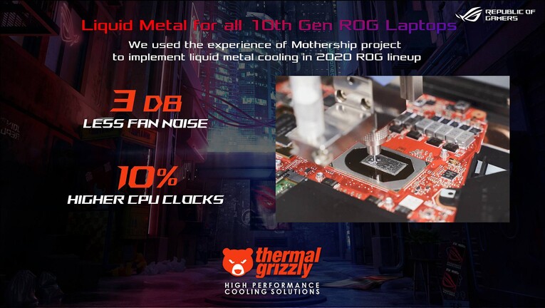 A másik általános újdonság a visszafogottabb kinézethez, jobb hordozhatósághoz kapcsolódik, ez ugyanis keskenyebb, kisebb gépházat eredményez, mely a nagyobb kapacitású akkumulátorral kombinálva azt jelenti, hogy a hűtésre extra teher hárul. Az alaplap területe minimálisra csökkent, úgyhogy a saját fejlesztésű hűtőrendszeren is tuningoltak. Ennek egyik eredménye, hogy feljebb tudták srófolni a TDP-t, például a Zephyrus S GX701 esetében a ROG Boost bekapcsolásával a GPU 80 helyett 100 watton dolgozhat, ami játéktól függően akár 10%-os gyorsulást is jelenthet. Magának a hűtésnek a hatásfokát „folyékony fémmel” növelik, ez gyakorlatilag a Thermal Grizzly Condoctonaut termékét jelenti, mely már a Mothershipben is felbukkant.