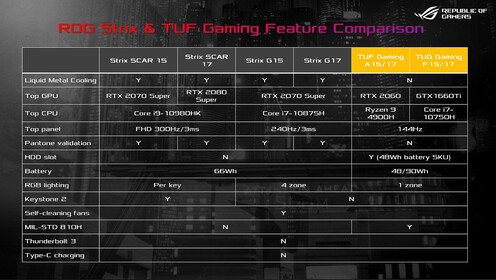 A G15/17 felett helyezkedik el a Scar 15/17 család, ahol a CPU opciók esetében megjelenik a Core i9-10980HK is, mely mellé RTX 2080 Supert (ezúttal a normál verziót) kérhetünk. Lesz gombonként beállítható RGB, három M.2 foglalat, 300 Hz-es kijelző is. A Scar 17-ből készül viszont egy tuningolt változat is, mely a teljes ROG család legerősebb noteszgépe lesz, egyszerre leváltva a Mothershipet és a G703-at. Ez a normál verziónál 1,5 mm-rel vastagabb (a teljes tömeg 2,85 kg), ez elég ahhoz, hogy nagyobb, hat hővezető csővel és négy bordával felszerelt hűtés kerüljön bele, és az RTX 2080 Super 150 wattos TDP-vel 1560 MHz-en dolgozhasson a gyárilag tuningolt Core i9-10980HK mellett.