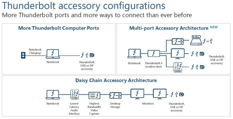 Maguk a dokkolók négy Thunderbolt 4 portot is kínálhatnak (egy upstream és három downstream), és egy mobil PC felébreszthető lesz pusztán a dokkolással, ráadásul az összeköttetésre vonatkozó lehetőségek is bővülnek az úgynevezett multi-port accessory architektúra által. Ezek mellett a Thunderbolt 4 aljzat töltésre is alkalmas, illetve az Intel bevezet egy védelmet a VT-d technológián keresztül a DMA-ra.