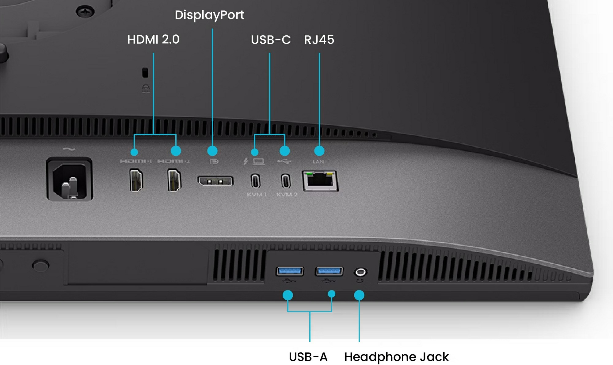 A 16 bites 3D-LUT-tal operáló konstrukció fedélzetén egy 1.4-es DisplayPort, két HDMI 2.0 bemenet, egy 96 wattnyi kakaót közvetítő, DisplayPort alt módos USB Type-C kapu, egy kizárólag adatot továbbító USB 3.2 Gen 1 Type-C upstream csatoló, két 4,5 wattos USB 3.2 Gen 1 Type-A konnektor, egy gigabites Ethernet, plusz egy 3,5 mm-es audio jack található, és az arzenáljából nem hiányzik a KVM kapcsoló, a PiP/PbP funkciók kettőse vagy az időzített kikapcsolás sem.