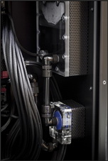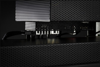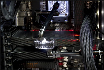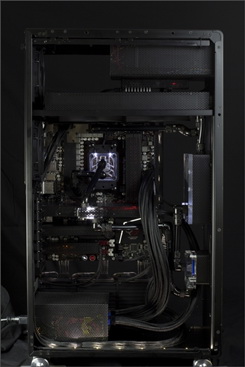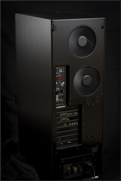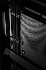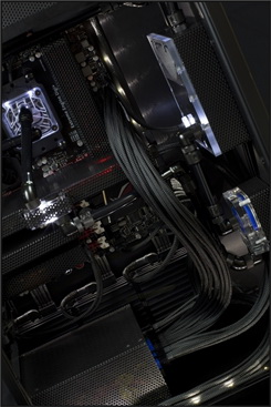 Ablakos oldallapját lepattintva is teljes „feketeség” fogadja a szemlélőt, egyedül a folyadékhűtés egyes komponenseiben lapuló LED-ek hoznak némi fényt a sötétségbe. A hardverelemek sokszínűsége sem felelt meg a koncepciónak, ezért rengeteg alkatrész feketére fényezett, perforált fémburkolatot kapott. Természetesen a kábelek is feketére harisnyázottak, a kábelrendezés – főleg az alaplaptálca mögött – szintén precíz. A csendesebb és akadálytalanabb hűtés érdekében a hátulsó ventilátorok védőrács nélkül tekernek, így nem árt a kíváncsi ujjakat és háziállatokat távol tartani a hátsó szekciótól.