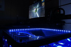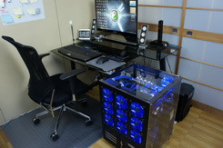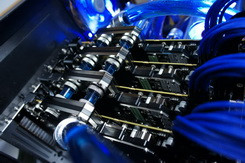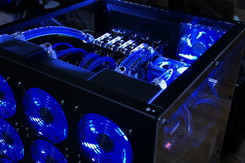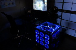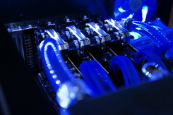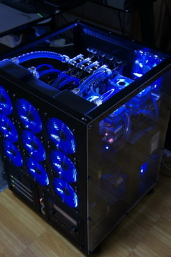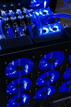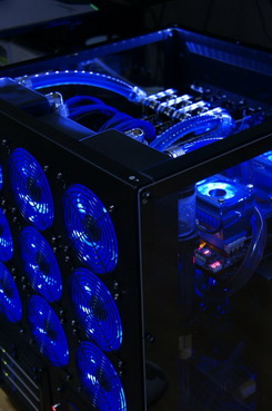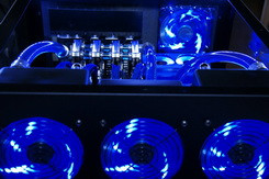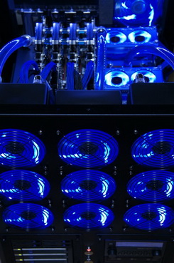 Szükség is van az erőteljes hűtésre, hiszen a beépített hardverek együttesen elég komoly mennyiségű hő termelésére képesek. A konfiguráció alapjául egy ASUS Rampage IV Extreme alaplap szolgált, amelybe egy 4,8 GHz-re húzott Intel Core i7-3960X processzor ketyeg, mellette 8 GB (4 x 2 GB) Kingston HyperX T1 memória található. A pörgős rendszerért 2 darab, RAID 0-ba szervezett, 240 GB kapacitású Corsair Force 3 SSD felel. A grafikus alrendszer sem kifejezetten a költségcsökkentésről szól, összesen 4 darab Sapphire HD 7970 sorakozik a beltérben. Egy ilyen bestia táplálása már valóban nem egyszerű feladat, a készítők ezért nem is egy, hanem rögtön két tápegységgel támogatták meg a Blue Nightmare-t, név szerint két Corsair AX-1200W-vel. Ami pedig a megjelenését illeti, az eredetileg piros színvilág minden szinten kékre változott: a tömlők, a harisnyázott kábelek és a LED-es ventilátorok, sőt, még egy a peremen végighúzódó megvilágítás is ezt a színt követi.