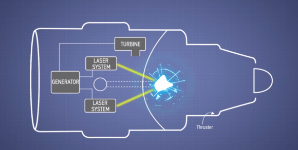 Nagy teljesítményű lézer lövi a deutérium vagy trícium alapú nukleáris hajtóanyagot, ezzel fúziós reakciót kialakítva a termonukleáris robbanótérben. A felhasznált üzemanyagtól függően Hidrogén vagy hélium termelődik, ami nagy nyomással hagyja el az égésteret, ezáltal hajtóerőt generálva.