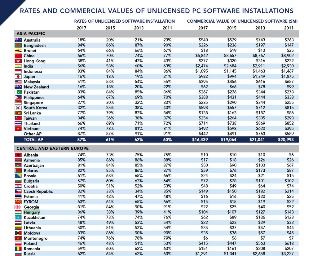 A BSA (Business Software Alliance), a legnagyobb szoftvergyártókat tömörítő szervezet ugyanis kiadta legfrissebb jelentését, és ezek szerint Magyarországon csökkent ugyan az illegálisan szoftvert használók aránya, de még mindig elég magas. A felmérés szerint Magyarországon a licenc nélküli szoftverek aránya eléri a 36 százalékot, amely 2 százalék csökkenést jelent a BSA előző, 2016-ban publikált felméréséhez képest – ezt emeli ki a BSA egyik oszlopos tagja, a Microsoft a közleményében.
