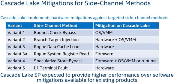A Meltdown, úgynevezett rogue data cache load variánsa ellen ugyanígy hardveresen védekezik a Cascade Lake, ahogy a nemrég felfedezett Foreshadow ellen is. Utóbbi valószínűleg nem tervezett, egyszerűen csak a Meltdownhoz beépített védelem működik.
