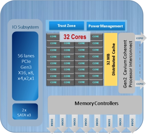 Az elmúlt időszak tehát sok szempontból befolyásolta a terveket, de a lényeg úgyis a végtermék, ami ebben az esetben nagyon ígéretesnek tűnik. Alapjaiban a Broadcom Vulcan IP-je köszön vissza. Ezt a Cavium úgy vásárolta meg, hogy a dizájn majdnem kész volt, vagyis csak be kellett fejezni. Ebbe a Broadcomot felvásárló Avago Technologies nem akart pénzt ölni, de a Cavium könnyedén megtette, hiszen illett a terveikbe. Így alakult ki a most bemutatott ThunderX2, aminek a magjai az ARMv8.1-es architektúrára épülnek, és 32 darab található belőlük egy lapkában. A maximum négy szálat futtató, 32-32 kB-os L1 adat és utasítás, illetve 256 kB-os L2 gyorsítótárat használó processzormagok négyes csoportokba rendeződnek, amelyekhez 4 MB-nyi L3 gyorsítótár tartozik, 2-2 MB-os szeletekre osztva. Összesen 32 mag található egy lapkában, így kitalálható az is, hogy az L3 gyorsítótár teljes kapacitása 32 MB.