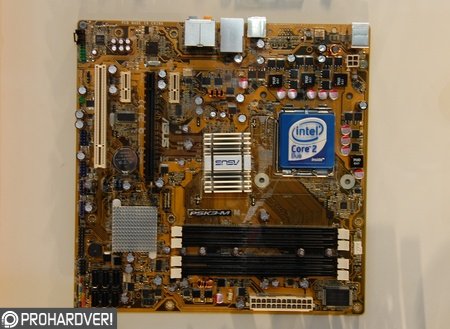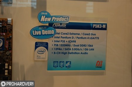 Az Asus standján két Bearlake-re épülő alaplapot is láthattunk; a microATX-es P5K3-M és P5K3-VM modellek rendre a középkategóriás P35 (Bearlake-P) és a belépőszintű, integrált grafikus magot is tartalmazó G33 (Bearlake-G) északi hidakat tartalmazzák. Előbbi a RAID funkciókkal is felruházott ICH9R, utóbbi a szerényebb képességű ICH9 I/O vezérlőt kapja, mindkét típus támogatja az 1333 MHz-es rendszersebességet, a P5K3-M pedig akár 1066 MHz-es DDR3 memóriákat is kezel, kétcsatornás üzemmódban. Az Asus újdonságai PCIe x16 és PCIe x1, valamint hagyományos PCI kártyákkal bővíthetők, a régi típusú (legacy) I/O vezérlők (soros, párhuzamos portok) ellenben teljesen hiányoznak az alaplapokról, csakúgy, mint a floppyvezérlő és a párhuzamos ATA port.