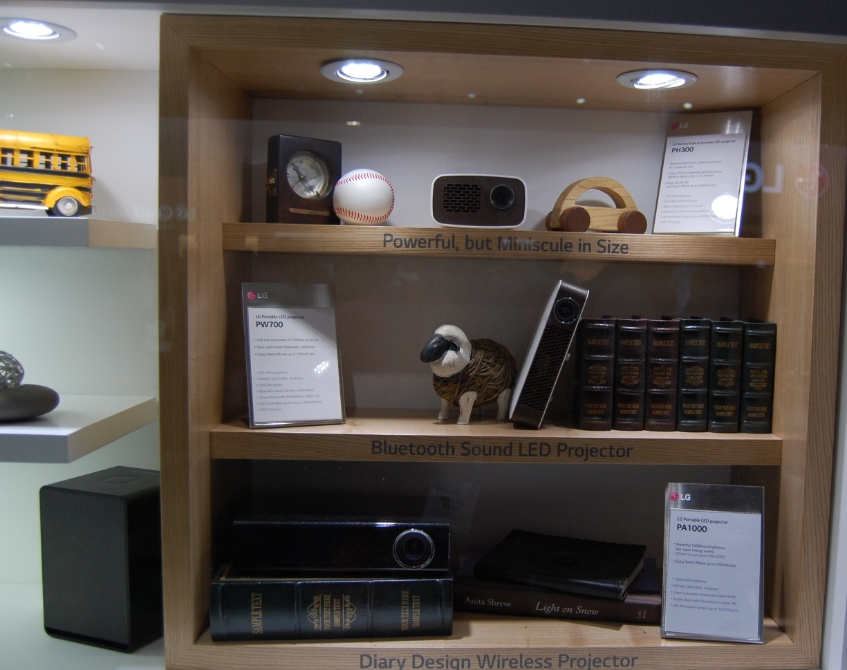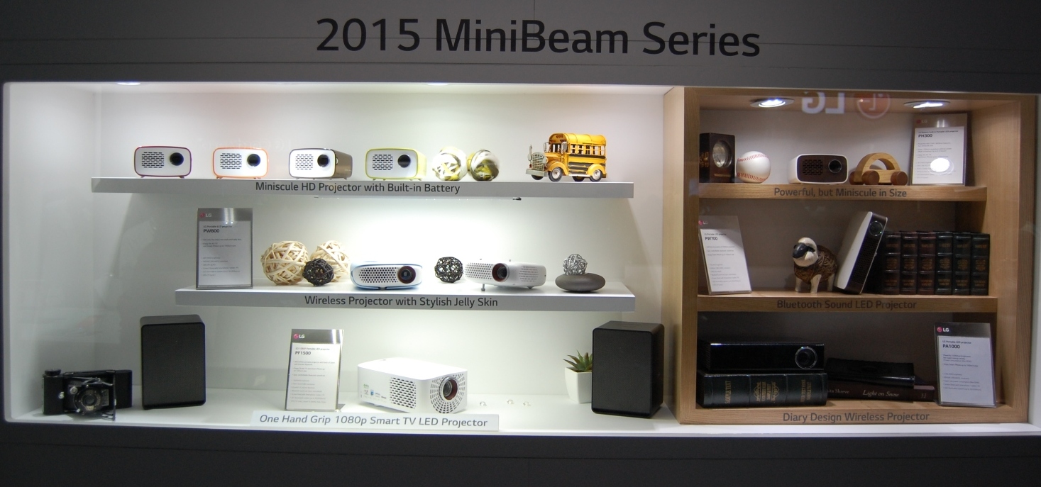 A jelek szerint az LG a korábbinál nagyobb hangsúlyt fektet a projektor üzletágra. A Minibeam család tagjait szokatlan módon egy könyvespolcra pakolták ki, de az összhatás kifejezetten ízléses lett. Mint látható, a paletta a hordozható vetítőktől egészen a komoly, nagy teljesítményű házimozi darabokig terjed. Egyelőre kérdéses, hogy ezek közül melyik jut majd el Magyarországra, reméljük, hogy minél több!