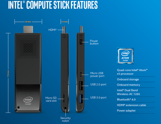 Az Intel a Las Vegas-i CES-en előhúzta a kalapból a legújabb HDMI Stick PC-it, becses nevükön a Compute Stickeket, amelyek a legújabb, Skylake-alapú Core m központi egységekre alapoznak, de az Atom SoC-ot sem vágták a sarokba. Az utóbbi egyébként a legolcsóbb kiadás lesz mindközül, négymagos Atom x5-Z8300 rendszerchippel, 2 GB RAM-mal, 32 GB-os eMMC belső tárral (akár 128 GB-os microSD kártyával bővíthető). HDMI 1.4 csatlakozóval, 1-1 darab USB 2.0-s és 3.0-s porttal, Dual Band Wireless AC 7265 Wi-Fi modullal és Bluetooth 4.0 kompatibilitással ellátva.