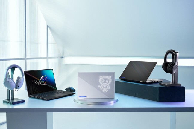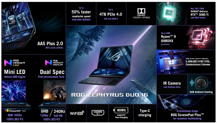 A vékony és jól hordozható Zephyrus család csúcsát az új Duo 16 képviseli, mely, mint neve is mutatja, dupla kijelzős. Kialakítása hasonlít a 2020-as Duo 15-re és az általunk tesztelt ZenBook Duo UX482-re, a másodlagos kijelző viszont a megnyitáskor nem egyszerűen felnyílik, de hátra is csúszik. Közben a fő kijelző is megnőtt, immár 16”-es és 16:10 képarányú (a gépház mérete viszont nem nőtt, csak a keret vastagsága csökkent). Belül itt is a továbbfejlesztett Liquid Metal kerül az AMD processzorokra, melyek közül a maximális opciót a 6980HX képviseli. GPU-ból RTX 3080 Ti-t is kérhetünk 150 wattos boost TDP-vel. Ezek mellé 4 TB SSD és 64 GB DDR5 memória kerülhet. A vezetékes LAN 2.5GbE sebességet kínál.