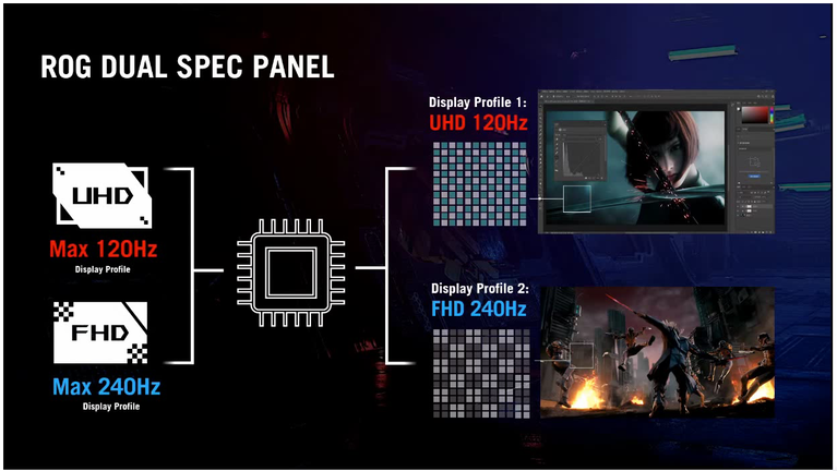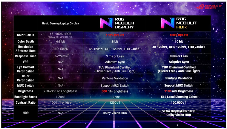 A megjelenítési oldalon kiemelnénk, hogy valamennyi új ROG notebookban helyet kap egy MUX átkapcsoló, így a dedikált és az integrált GPU egyaránt közvetlenül (vagyis a MUX-on keresztül) csatlakozik a képernyőhöz, ami energiát takarít meg és a teljesítményt is növeli. Ez a „direct GPU” üzemmód az ASUS állítása szerint a késleltetést is csökkenti, a megjelenítés gyorsulása pedig átlagosan 9% lesz. A direktebb kapcsolatot a külső megjelenítők használatakor is élvezhetjük, ugyanis mind a HDMI, mind a DisplayPort közvetlenül a dGPU-hoz csatlakozik valamennyi modellnél. A dupla Type-C konnektorral rendelkező ROG notebookokban az egyik az iGPU-val, a másik a dGPU-val áll közvetlen kapcsolatban, és ez utóbbi G-Syncket is kínál. A képernyők esetében egy új marketingnévvel kell megismerkednünk, ez az ROG Nebula. Ezzel az ASUS egyfajta szabványt kívánt teremteni, és meghatározni olyan minimumkövetelményeket, melyeket az adott panelnek teljesítenie kell ahhoz, hogy „Nebula” (illetve Nebula HDR) kijelzőnek nevezhessük.
