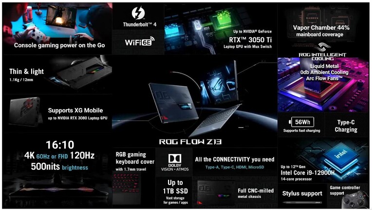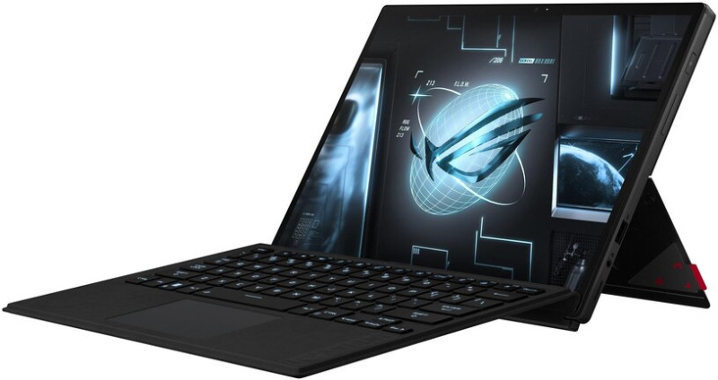 Az utolsó ROG újdonság idénre a Flow X13 kistesója, a Flow Z13, mely mindössze 1,1 kg tömegű. Ez részben persze annak is köszönhető, hogy ez egy szétszedhető 2 az 1-ben gép, tehát a tablet és a billentyűzet két külön egységet képez. A tabletrész maga az, ami 1,1 kg-os és 12 mm vastag, ehhez mágnesesen és pogo-pines konnektorral csatlakozik a gyári tartozék klaviatúra, ami még RGB világítással is rendelkezik. További "teljesítménynövelő" tényező lehet még a tablet hátoldalán található üvegbetét, melyen át rálátunk az RGB fényekben pompázó alaplapra is. Kijelzőként az X13-ban is rendelkezésre álló panelek közül válogathatunk.