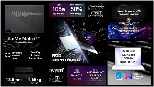 A hűtésnél vapor chambert használnak az új Ryzen 9 CPU és mobil RX6800S Radeon GPU hidegen tartására. Ez utóbbi 105 wattos TDP-vel dolgozik, ami 50%os tuningot jelent.