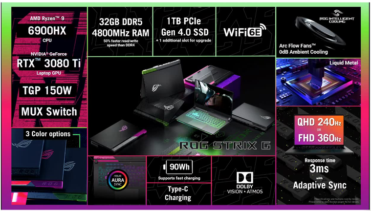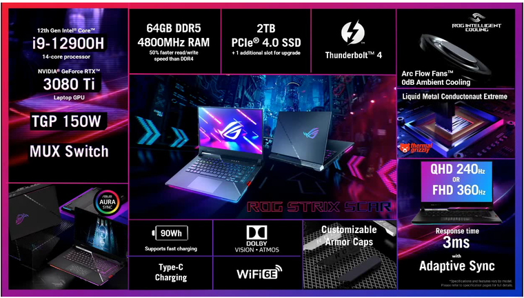 Amennyiben ez a hardver egy noteszgép, akkor a ROG portfólió három szegmensben kínál 2022-ben újdonságokat: ezek a Strix (G és Scar), a Zephyrus, és a Flow lesznek. Nézzük meg először az általános újításokat! Ezek egy része a teljesítményre koncentrál: 12. generációs mobil Intel processzorok, RTX 3080 Ti és 3070 Ti GPU-k, új AMD Ryzenek (Radeonnal) kerülnek a burkolat alá. A memória esetében megjelenik a DDR5-4800, mely valamennyi 2022-es ROG notebookba bekerül (legyen szó akár inteles, akár amd-s modellről). A háttértárak számára minden modellnél (legalább) két PCIe 4.0-s foglalatot kapunk majd, így a második NVMe meghajtó is ilyen sebességgel dolgozhat.