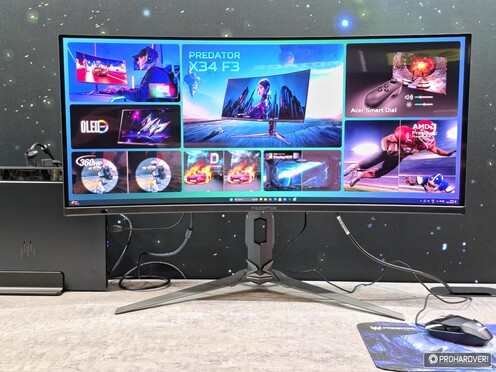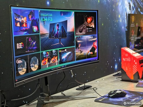 A Predator termékcsalád másik üdvöskéje a 34 hüvelykes, kvantumpontos OLED panelre épülő Predator X34 F, ami a 3440x1440 pixeles felbontást 360 Hz-es képfrissítéssel hozza, 300 cd/m²-es fényereje HDR módban pedig 500 cd/m²-ig kúszhat fel. A natívan 10 bites, 0,03 ezredmásodperces szürkéből szürkébe váltással operáló, ívelt képernyő DCI-P3 színskálája 99 százalékos, és bár csatlakozói egyeznek az egy bekezdéssel fentebb ismertetett márkatársánál látottakkal, az integrált hangsugárzói 2 helyett 5 wattosak. Az AMD FreeSync Premium Próval dolgozó apparátus 100 x 100 mm-es VESA furatokhoz erősített állványa a pivotba forgatás kivételével bárhogy üléshelyzetünkhöz igazítható.