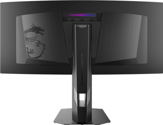 A hátulján Mystic Lightos hangulatvilágítással feldobott, KVM váltós periféria I/O szigetén egy UHBR 13.5-ös DisplayPort 2.1a bemenet, két HDMI 2.1 csatoló, egy 98 wattos, DisplayPort alt módos USB Type-C kapu, két USB 3.2 Gen 1 Type-A konnektor, plusz egy 3,5 mm-es jack táborozott le, és 100 x 100 mm-es VESA furatokhoz rögzített, kábelvezető réssel perforált talpazata a pivotba forgatás kivételével mindenhogy állítható.