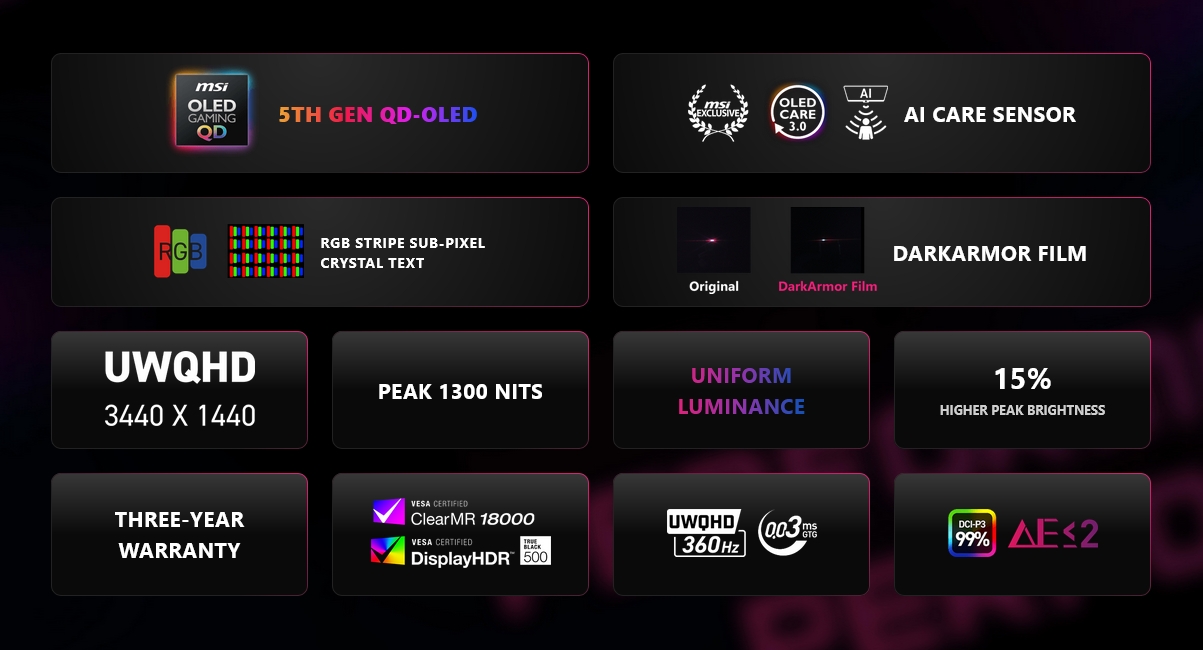 Az 1800R íveltségű, 34 hüvelykes készülék 3440x1440 pixeles felbontással, 360 Hz-es képfrissítési rátával, 1300 cd/m²-ben tetőző, 300 cd/m²-es tipikus fénysűrűséggel és a kategóriában megszokott, 0,03 ezredmásodperces GtG válaszidővel rendelkezik, miközben az 1,07 milliárd színt 139/99/98 százalékos sRGB/DCI-P3/Adobe RGB színtérlefedettséggel varázsolja elénk. A VESA DisplayHDR500-as, VESA ClearMR 18000-es és TrueBright minősítésekkel bíró, Adaptive Sync-es kijelző delta E<2 színpontosságú gyári kalibrációval érkezik, és játékosokat segítő okosságokkal (például: okoscélkereszt, AI Vision, többlépcsős zoom, stb.) ellátott OSD menüje az Intelligence szoftveren vagy az MSI Remote Display mobilapplikáción keresztül is babrálható.