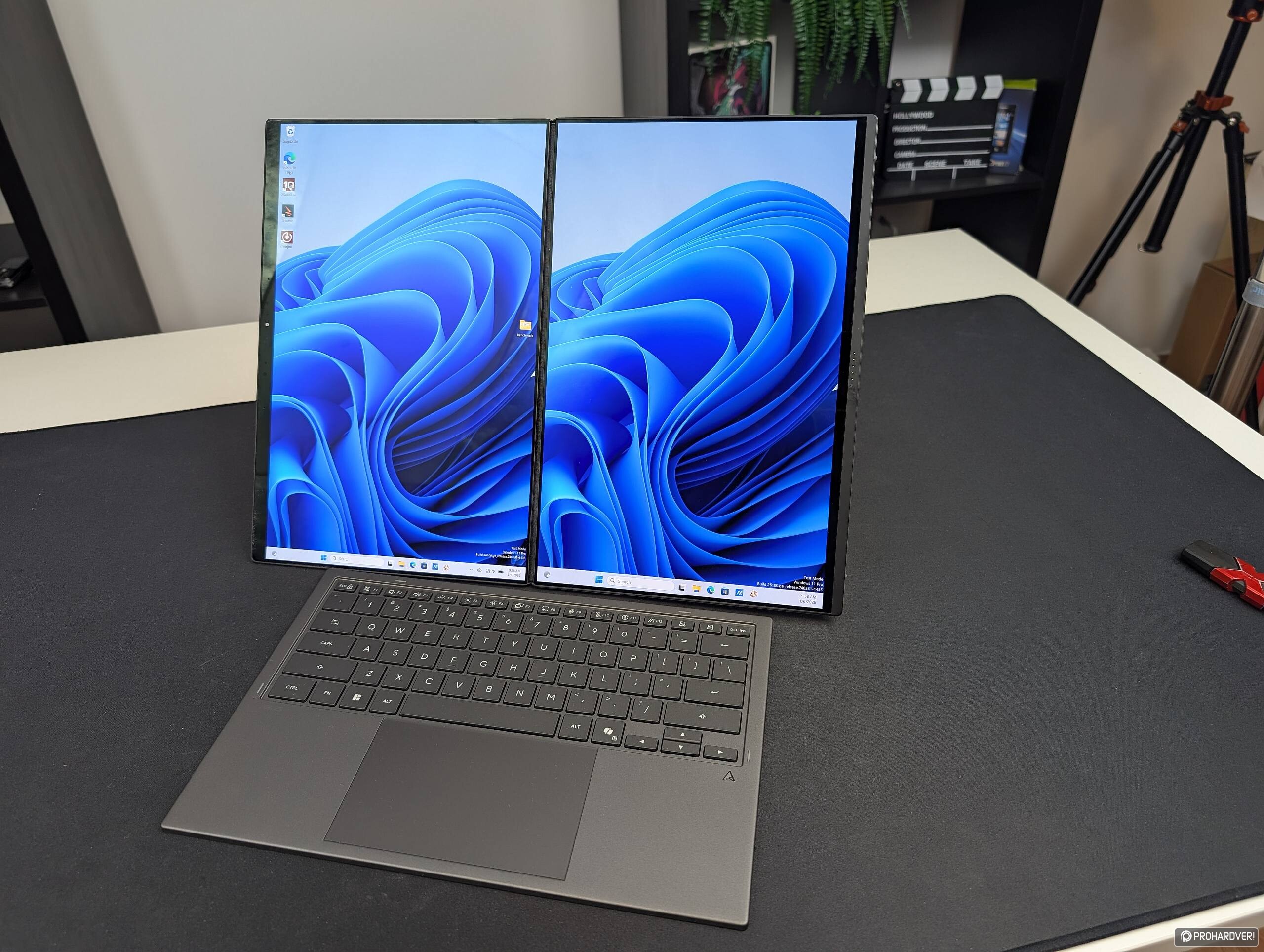 Hosszú hagyománya van már az ASUS dupla kijelzős notebookjainak: az első változat még 2019-ben jelent meg, fizikai billentyűzettel, majd a másodlagos kijelző növekedésével a klaviatúra külön egységgé vált, és a 2024-ben megkaptuk azt a Duót, amely már alul-felül egy-egy teljes értékű, 14 hüvelykes panellel szolgálta a szimpla noteszgépnél nagyobb képre vágyókat. Ehhez képest a tavalyi CES-en bemutatott UX8406CA nevű változat csak a belső hardverben hozott újat, mégpedig elsősorban abban, hogy a Meteor Lake-et lecserélték az akkor friss Arrow Lake H-ra, viszont a külsőhöz nem nyúltak, ami azt jelentette, hogy megmaradt a Duo leggyengébb pontja, a zsanér. Ezzel fő problémánk az volt, hogy kialakítása miatt egyszerűen nem tette lehetővé a két kijelző egy síkba fektetését, márpedig egy asztalon teljesen, 180 fokban „kiteríthető”, illetve megdöntve két egymás mellé helyezett monitort szimuláló eszköznél rendkívül zavaró volt ez a megjelenés. Ezért is örömhír, hogy a most bejelentett UX8407AA esetében nem egyszerűen a Panther Lake beépítésére került sor, hanem végre megkapjuk azt a dupla forgástengellyel rendelkező zsanért, ami például már 2017-ben is ott volt a tajvaniak eszköztárában.