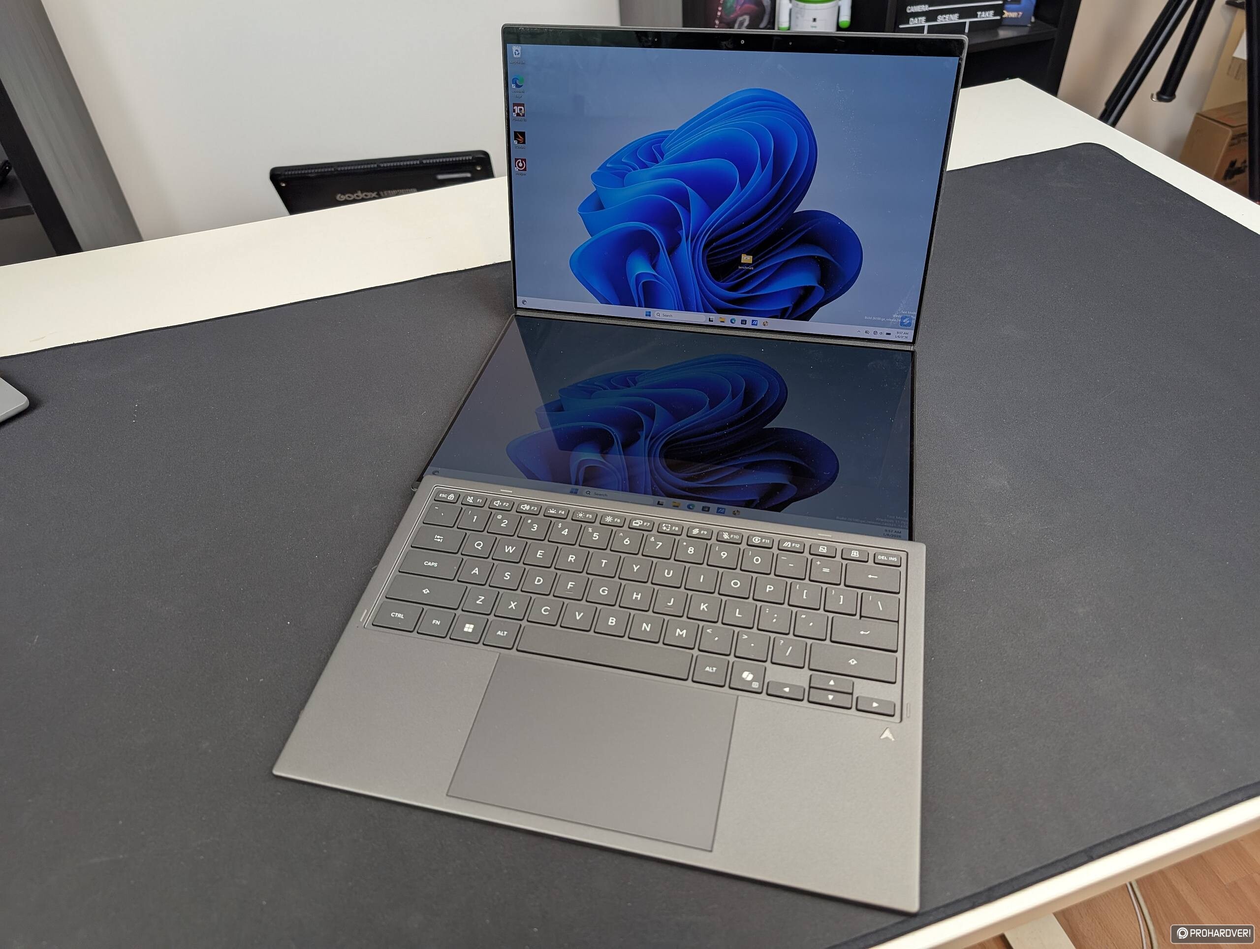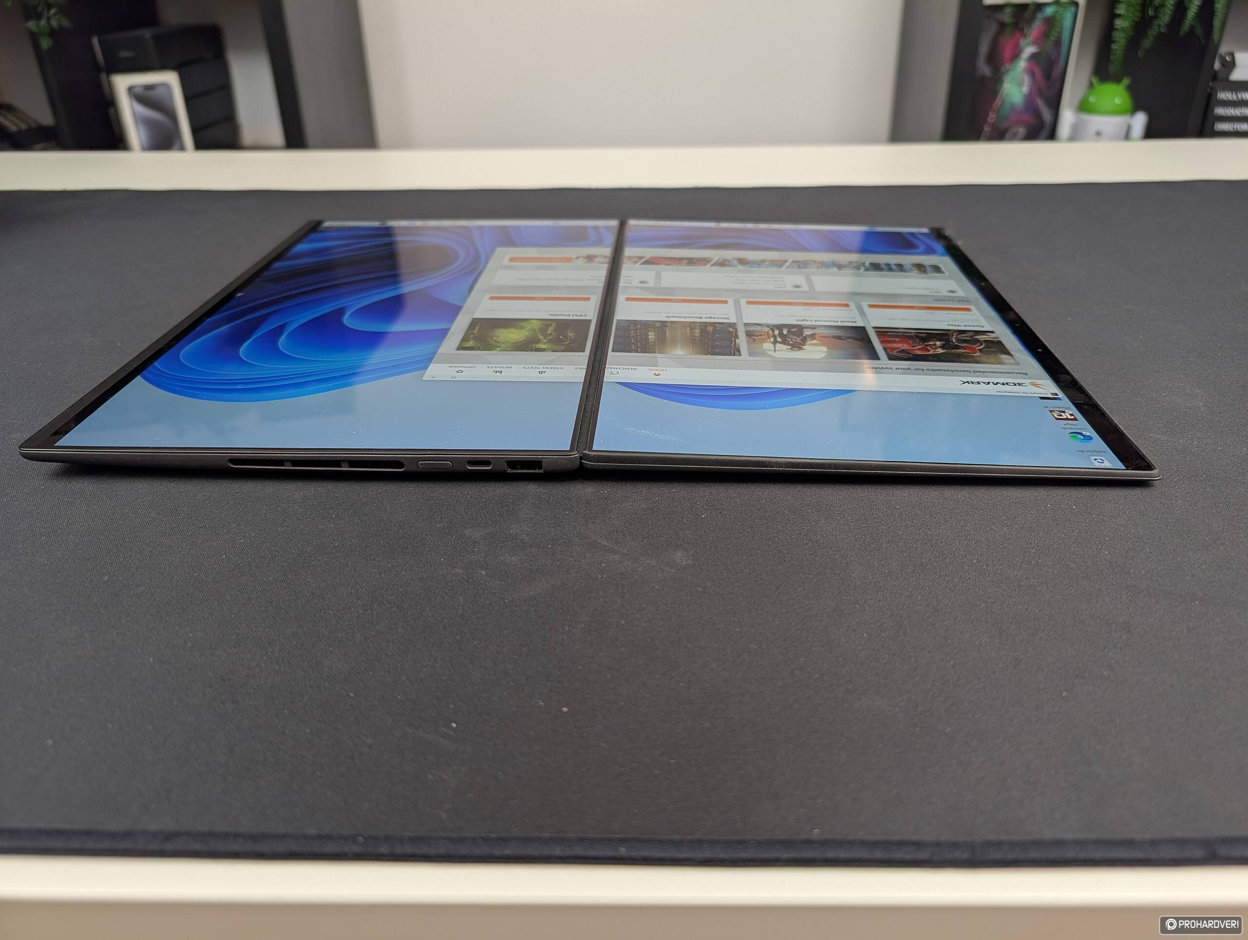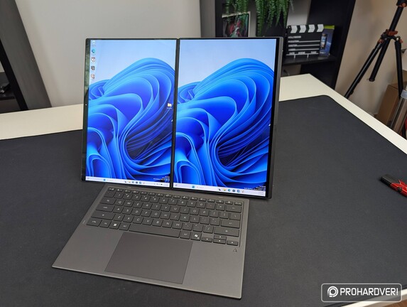 A kijelzők mérete nem változott, maradt 14”-es, de közelebb kerültek egymáshoz, így kevésbé feltűnő az elválasztás. Mindkét panel Lumina Pro OLED, 2880x1800 pixeles felbontással, 144 Hz-es maximális frissítéssel és 1000 nites csúcsfénnyel. A hangrendszer hat sugárzóra épül, a hűtés pedig 45 wattos TDP-vel is megbirkózik, ami az ASUS állítása szerint többek között a 24%-kal növelt légáramlásnak is köszönhető. A gép próbálgatása során a sebességre nem is volt panaszunk, és a hűtés zaja sem emelkedett vállalhatatlan magasságokba. Az előző generációval összevetve az általános feladatokban 10% körüli gyorsulást tapasztaltunk, a multimédiás és 3D-s képességekben ennél kevesebb volt az előrelépés, de ne feledjük, hogy egy nem végleges beállításokkal, firmware-rel futó mintapéldány volt a kezünkben.