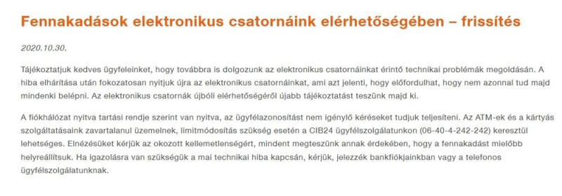 Délelőtt az alábbi kurta tájékoztatás jelent meg: „Tájékoztatjuk kedves ügyfeleinket, hogy elektronikus csatornáink elérésében jelenleg technikai okból fennakadások lehetnek. A probléma elhárítása folyamatban van. Az okozott kellemetlenségért elnézésüket kérjük, köszönjük megértésüket, türelmüket!” Ezek után kora délután már frissítették a közleményt:
