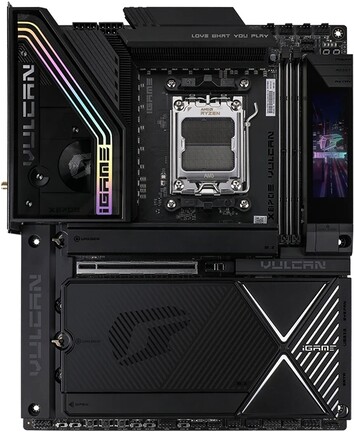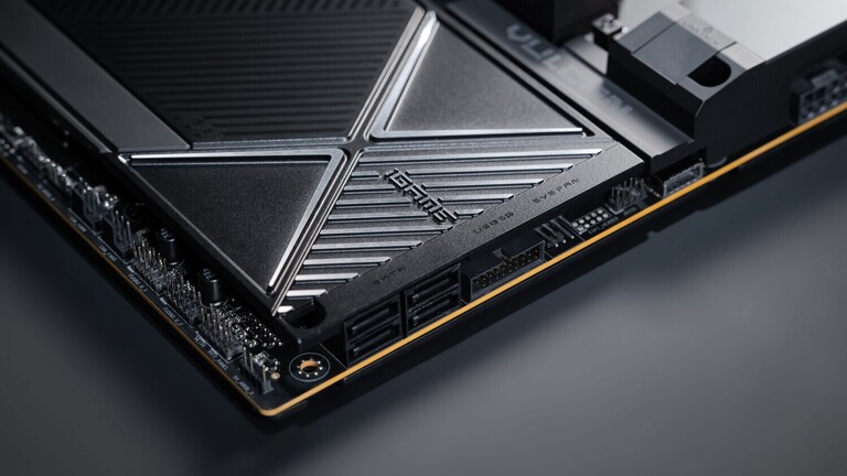 Az AMD X870E vezérlőhíddal érkező, ATX-es megoldás két memóriafoglalatába maximum 128 GB-nyi DDR5 memóriát helyezhetünk, és – tuning keretében – az effektív órajel plafonja 8 (Ryzen 7000), 8,6 (Ryzen 9000) vagy 10 GHz (Ryzen 8000) lehet. A deszka DIMM slotjai mellett egy 268x800 pixeles felbontású, színes LCD kijelző nyert elhelyezést, amivel a monitorozáson kívül vizuális tartalmakat is megjeleníthetünk, felette pedig a power/reset/retry gombhármas trónol. A tízrétegű nyomtatott áramköri lapon két nyolctűs EPS csatlakozó figyel, míg kompakt háttértárolóinkat öt, bordával fedett M.2 aljzat (egy PCI Express 5.0-s M.2 2280/22110, két PCI Express 5.0-s M.2 2280 és két PCI Express 4.0-s M.2 2280) várja.