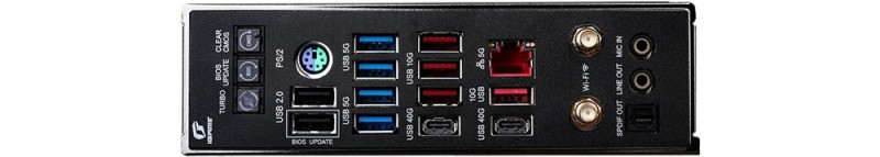 A fixen rögzített hátlapon egy BIOS update/Clear CMOS/Turbo gombtrió, egy PS/2 kombóport, két antenna konnektor és két USB4 Type-C, négy USB 3.2 Gen 2 Type-A, négy USB 3.2 Gen 1 Type-A, valamint két USB 2.0 kapu táborozott le a két darab 3,5 mm-es jack, az optikai hangkimenet, no meg a fentebb említett LAN interfész társaságában. Gépházunk előlapjára egy 20 Gbps-os USB 3.2 Gen 2x2 Type-C, két USB 3.2 Gen 1 Type-A és két USB 2.0 csatoló költöztethető ki, miközben rendszerhűtő ventilátorainkat négy PWM tüskesorra köthetjük ré. A négy 3 tűs/5 voltos ARGB headerrel megtoldott, kérdéses árú konstrukció túloldalán fém backplate található, ami a komponensvédelmi feladatokon felül az újdonság hűtéséhez ugyancsak asszisztál, és némi fedélzeti (természetesen címezhető) hangulatvilágítás is akad a receptben.