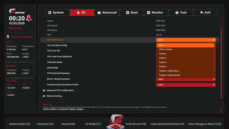 A firmware-ben külön okosságok vannak az X3D CPU-k hergeléséhez (mesterséges intelligencia algoritmusokból profitáló X3D Ai Turbo vagy X3D AI High Frame Rate Mode, az alapórajel és a PBO paraméterek automatikus optimalizációja, számos manuális profil), és az I/O plate-en lévő, korábban már szóba hozott Turbo gomb egy pöccintésre megdobja a teljesítményt.