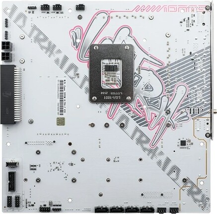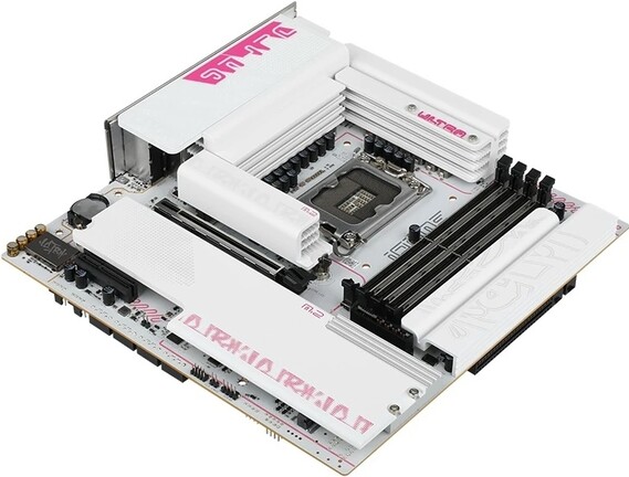 A csipetnyi rózsaszínnel feldobott fehér köntösbe öltözött hardver microATX formátumban feszít, viszont 250 x 244 mm-es, tehát a konvencionális modelleknél 6 mm-rel szélesebb. A 14+1+1+1 fázisos, 60 amperes Dr.MOS VRM-jén testes alumíniumbordázatokat viselő, Intel Z890 chipsetre épülő típus négy DIMM foglalatába 256 GB-nyi, tuninggal 8400 MHz-es effektív órajelen hajtott DDR5 memória rakható, miközben a bővítőkártyákat egy fémmel megerősített, x16-os PCI Express 5.0, illetve egy szimpla, x4-es PCI Express 4.0 sín várja.