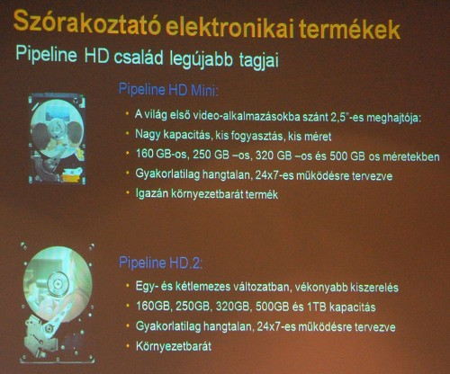 A Momemtus sorozata notebookokba készült, ennek tagjai 5400 rpm-es és 7200 rpm-es verzióban is elérhetőek. Ezek szabadesésszenzorral is fel vannak szerelve. Szórakoztatóelektronikai vonalon újdonság a Pipeline HD szériája, amiket főleg a videostreamek kiszolgálására fejlesztettek ki. A HDD-k 2,5"-ös (HD Mini) és 3,5"-os (HD 2) méretben is elérhetőek, 160 GB-tól 1 TB-os kapacitásig. Asztali környezetbe Barracuda sorozatát ajánlja a gyártó. Ezek a 12. generációs készülékek 1 TB, 1,5 TB és 2 TB tárhellyel kaphatók, 5900 fordulat per perces sebességgel működnek, ám mindössze 2 bel erősségű hangot adnak ki. A Seagate előadásán a másik újdonságot a cég dokkolói jelentették. A FreeAgent család három tagja a Go Dock, Dock+ és a Star típusok. Az eszközökre kötött winchesterek megoszthatók az interneten, így bárhonnan elérhetővé válnak, tehát egyfajta szerverként is üzemeltethetjük. Említés esett még a Replicáról is, ami az Apple TimeMachine-jához hasonlan adatmentésre használható. USB portra kötve gombnyomásra ment le mindent, akár több számítógépről is egy Replica készülékre. A BlackArmor ennek az 50 darab számítógépet is kezelő, nagyobb változata akár 8 TB tárhellyel.