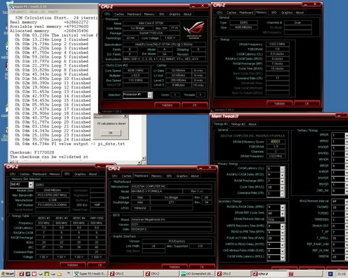 Elsőként itt van például a Super Pi 32M, amely egy DDR3 2646 MHz-en járatott, CL5-9-7-18 1T időzítésű memóriával 4 perc 44,732 másodperc alatt futott le. Az eredményt Fredyama-san és Shamino csikarta ki a rendszerből, amelynek alapját egy ASUS Maximus V Formula alaplap és egy Intel Core i7-3770K processzor képezte.