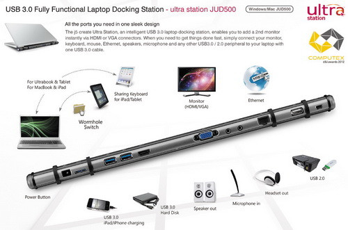A Computexen a j5create nevű cég olyan termékekkel állt elő, amely nem csak nekünk, de úgy tűnik, a szakmai zsűrinek is elnyerte a tetszését, ugyanis a JUD500 Ultra Station dokkolót kategóriájában Computex d&i (dizájn és innovációs) díjjal jutalmazták.