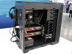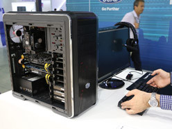 A legkisebb, multimédiás szórakozásra szánt gépet az apró Elite 110 Mini-ITX házba tették, a processzorra a Seidon vízhűtőszéria legkisebb darabja, a 120V Plus került, egy JetFlo ventilátor társaságában, a meghajtásról a G650M táp gondoskodott, a beviteli eszközöket pedig a QuickFire Rapid i billentyűzet Mizar egér és Resonar headset képviselte, utóbbi egy új, hallójáratba dugható fülhallgató. Nagy kedvencünk, a CM 690III ház is megmutatta magát a V750S táppal, Reaper egérrel és Sirius-C headsettel, és itt egy teljesen új termékkel is találkoztunk. A Hyper D92 két darab 92 milliméteres ventilátor közé fogott bordasorral bír, amit négy darab hőcső tart össze. A jobb hőátadás érdekében a csövek közvetlenül érintkeznek a processzorral. A 636 grammos, tehát középsúlyba sorolható hűtő kompatibilis a ma forgalomban lévő Intel és AMD processzorfoglalatokkal.