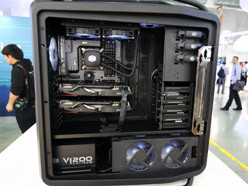 Az abszolút csúcskonfigot egy Cosmos II-be telepítették. Itt is megvillant egy új komponens a dupla 140 milliméteres ventilátorral ellátott Nepton 280L kompakt vízhűtés, aminek átdolgozták a központi, pumpa-vizesblokk egységét, hogy még csendesebben, még kevesebb rezgéssel működjön. A V1200 Platinum táp is említést érdemel, ugyanis egy olyan DC-DC rendszerű modellről van szó, ami elérte a 80 Plus tanúsítás platina fokozatát, tehát feles terhelésen 92%-nál magasabb a hatásfoka. Ennél még egy lépcsővel magasabbra is feljutott a Cooler Master, a Computexen jelentette be a Digital 1200 tápot, ami 80 Plus titán fokozattal bír, vagyis feles terhelésen nem kevesebb mint 94% a hatásfoka, és teljesen kihajtva sem csökken a hatékonysága 90% alá. További érdekessége, hogy Bluetooth modulja révén Android vagy iOS eszközzel is rácsatlakozhatunk, hogy monitorozzuk a fogyasztását, hatékonyságát, hőmérsékletét és ventilátora fordulatszámát.
