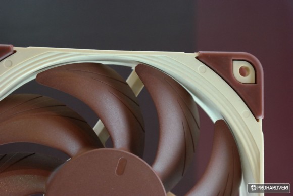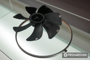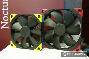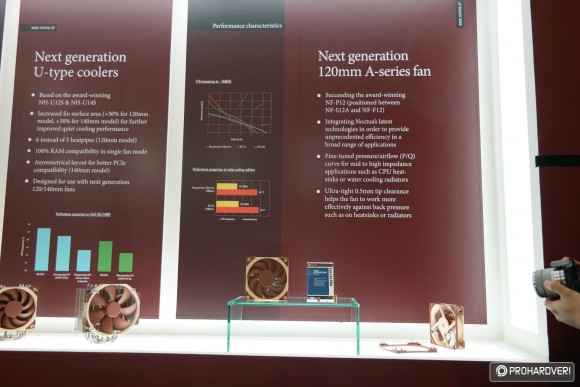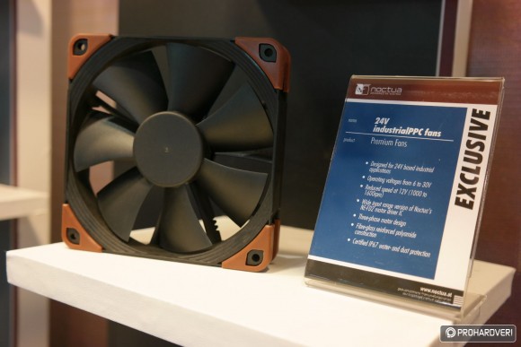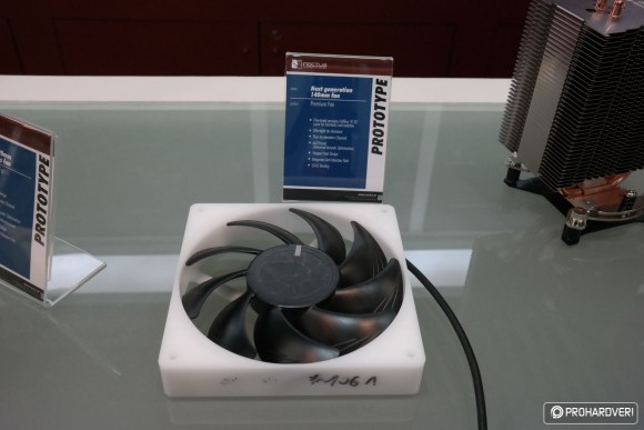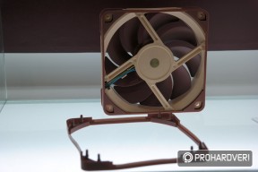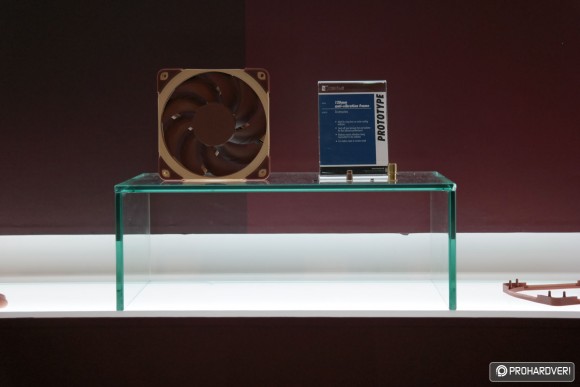 Készül ugyanis az NF-S12A és NF-F12 közé pozicionált NF-P12 utódja, ami prototípus állapotban már látható volt a standon. A leglényegesebb újítása ennek a ventilátornak, hogy a lapátok széle olyannyira közel került a kerethez, amennyire korábban még soha sehol és semmikor. Konkrétan 0,5 milliméterről beszélünk, ami jótékony hatással van a ventilátor hatásfokára és zajszintjére egyaránt.