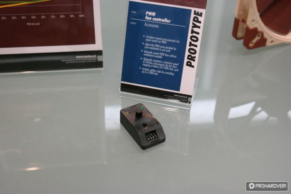 Tovább haladva előkerült egy szintén prototípus külső PWM ventilátorvezérlő, ami külön lesz majd megvásárolható és egyszerre akár hat ventilátor is felfűzhető lesz rá. Ennek segítségével felülbírálhatjuk az alaplapi PWM-szabályozást, sőt akár erre sincs szükség, ugyanis a kis vezérlőről minden kézzel állítható lesz.