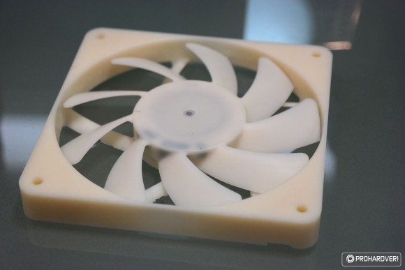 Maradva a prototípusoknál készül a slim 120 mm-es ventilátor is, ám ennek egyelőre csak a CNC-zett demóját láthattunk. Persze megkérdeztük azt is, hogy miért nem 3D nyomtatással készítik a fejlesztési fázisban az egyes próbadarabokat, aminek az az egyszerű oka, hogy 3D-s eljárással kapott munkadarabok anyagminősége nem olyan jó még, mint a CNC-vel készített daraboké.