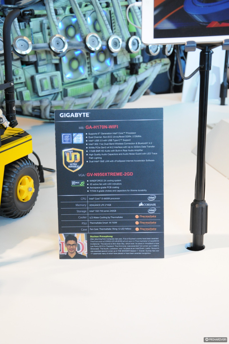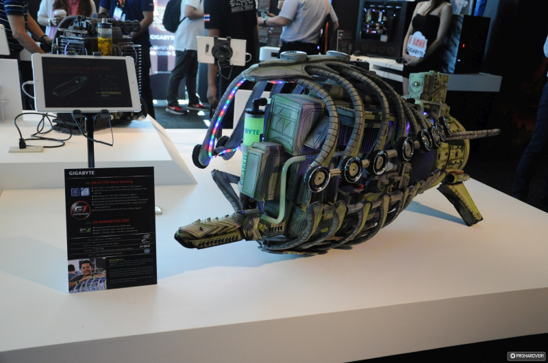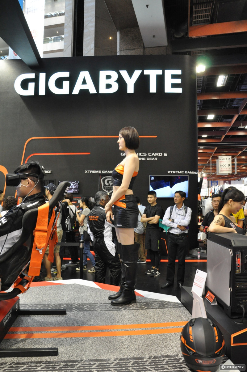 Aki a Gigabyte-ot eddig hiányolta, most azok lélegezhetnek fel, természetesen meglátogattuk őket is, ahol volt RGB-s hardver bőséggel, modokat is állítottak ki, a VR is kipróbálható környezetben jutott szerephez, azonban nem mindent csináltak ugyanúgy, mint a többiek. A VR megoldásuk a lövöldözőstől eltérően egy profi megoldású autóversenyzős volt. A szimulátorba a még nagyobb valósághűség érdekében Gigabyte-os overallban lehetett beülni, a külső szemlélőket pedig egy kilencmonitoros óriásképernyőn kényeztették vizuálisan.