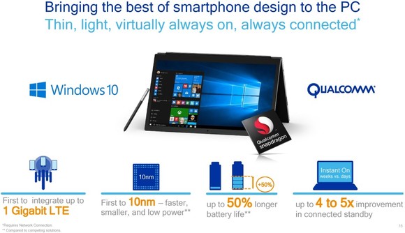 A Qualcomm a mobil PC fő előnyeként a mobilitást hangsúlyozta ki. Nem azt a mobilitást, amit eddig egy notebookon értettünk, hanem olyan szintűt, ami csak az telefonokra és a tabletekre volt jellemző. A kis platformdizájn egyrészt nagy akkumulátor beépítését teszi lehetővé, emiatt nőhet az üzemidő, ugyanakkor egy Snapdragon 835 takarékosabb is, mint egy Kaby Lake-Y. Elvileg a vállalat mobil PC-je annyira keveset fogyaszt, hogy egy mai rendkívül vékony notebookot teljesen lemerítő feladatsort el lehet végezni rajta úgy, hogy csak az akkumulátor kapacitásának a fele vész majd oda. Eközben a készenléti állapot is teljesen más szintet képvisel. Amíg a mai PC-k legtöbbször csak az alacsony üzemidőt kínálják ebben a módban, addig a Snapdragon 835-tel még állandóan figyelhet Cortana is, illetve a felhőben tárolt adatok szinkronizálhatók a háttérben, lényegében beavatkozása nélkül. Technikailag ez a mostani notebookokkal is megvalósítható, csak rendkívüli módon eszi az akkumulátort. A Qualcomm szerint ezekkel a készenléti módban futó szolgáltatásokkal egy Snapdragon 835 négyszer-ötször tovább bírja, mint egy mai vékony notebook.